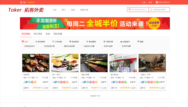 通过奇点外卖预订系统可以方便的基于地址位置搜索到附近的盒饭、水果、饮料、蛋糕等外卖信息。