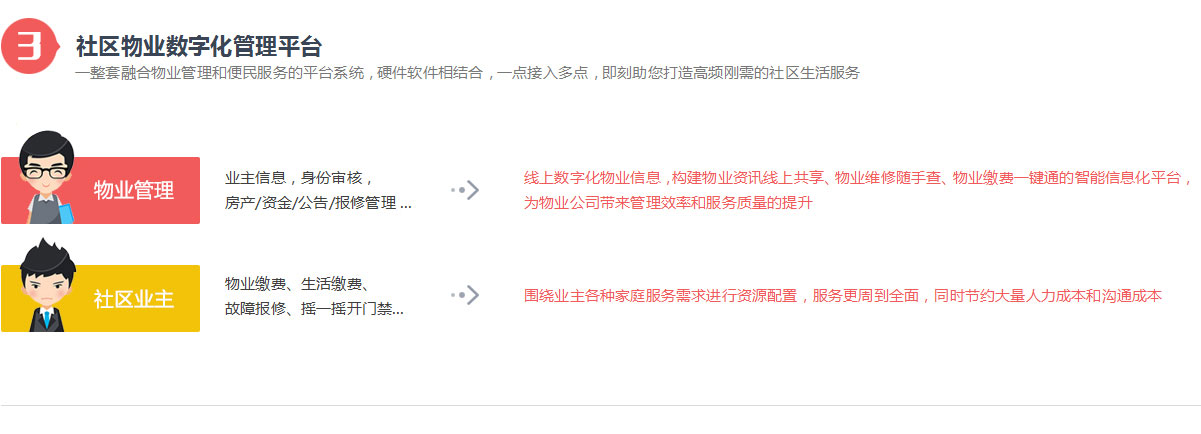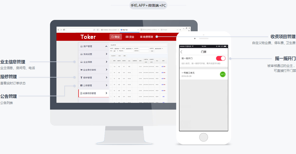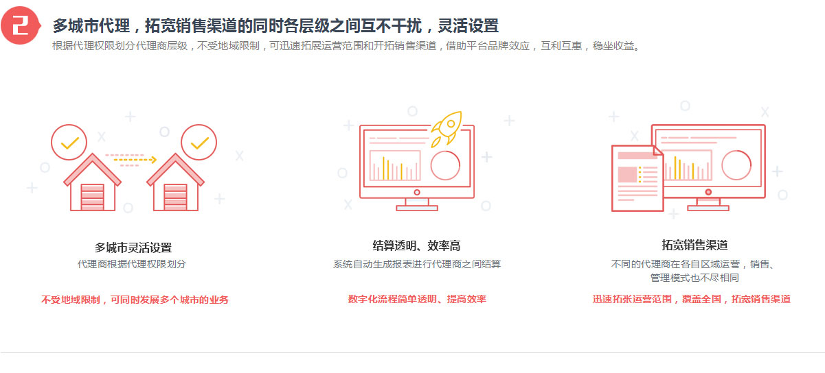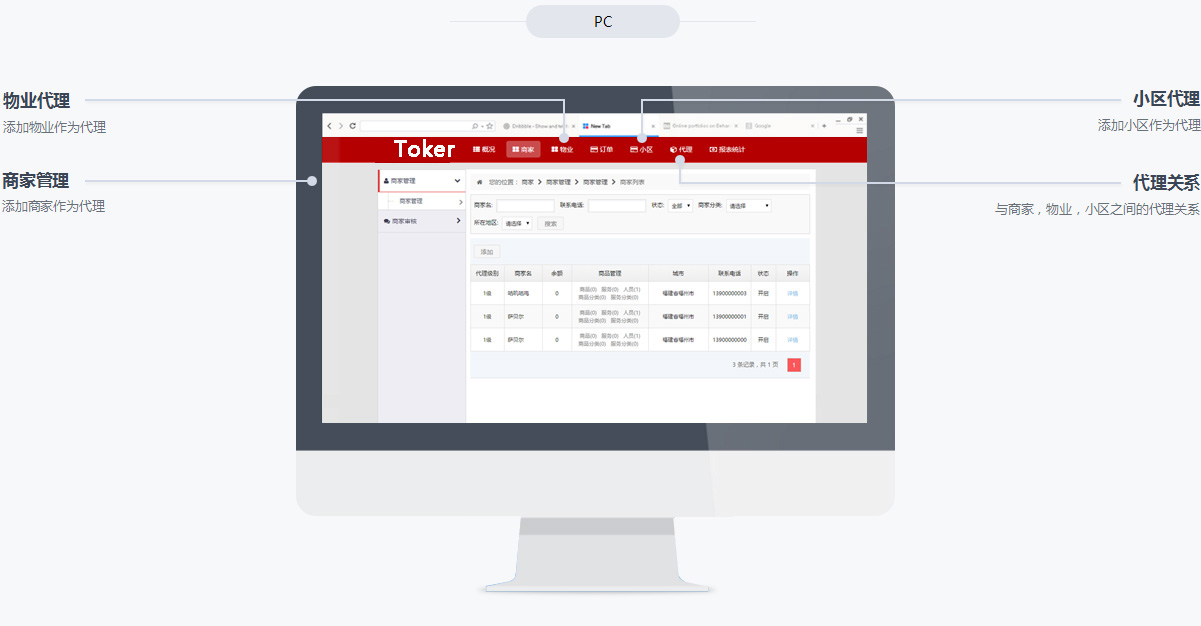 一套系统囊括用户、物业、加盟商家、多级代理、平台运营者多个关系链条,不同使用角色各自拥有独立的管理后台,